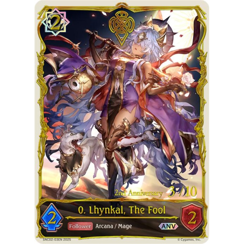 Set Name: Gods of the Arcana Release Date: 2025-06-20 Rarity: Anniversary Card Name: 0. Lhynkal, The Fool Card Number: SNC02-03EN Types: Follower Class: Runecraft Cost: 2 Attack: 2 Defense: 2