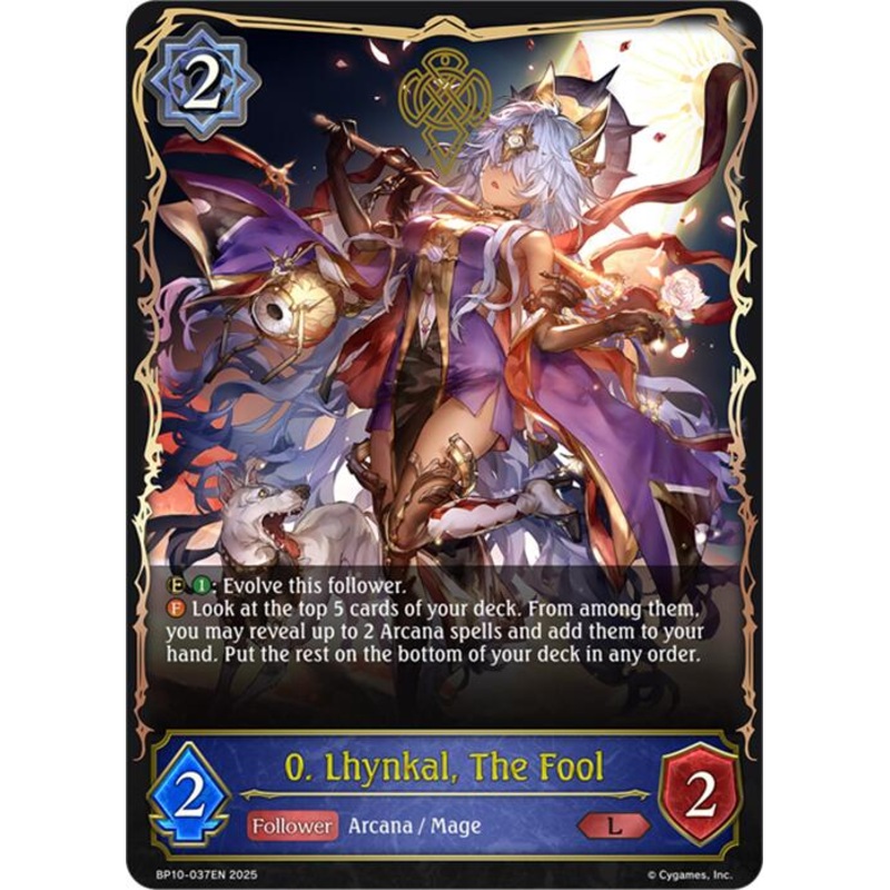 Set Name: Gods of the Arcana Release Date: 2025-06-20 Rarity: Legendary Card Name: 0. Lhynkal, The Fool Card Number: BP10-037EN Types: Follower Traits: Arcana,Mage Class: Runecraft Cost: 2 Attack: 2 Defense: 2