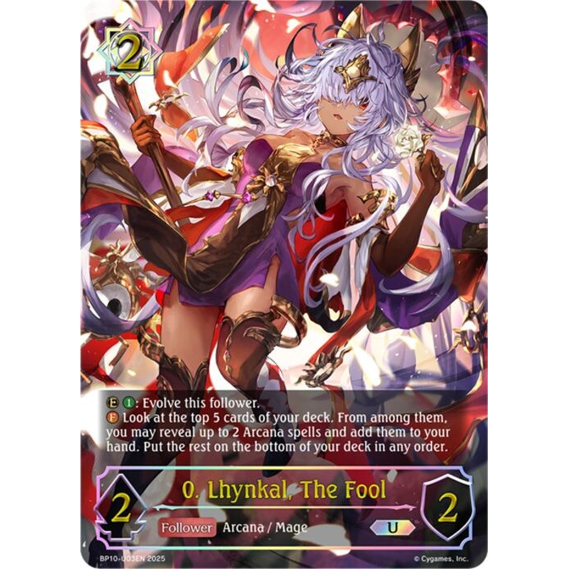 Set Name: Gods of the Arcana Release Date: 2025-06-20 Rarity: Ultimate Card Name: 0. Lhynkal, The Fool Card Number: BP10-U03EN Types: Follower Class: Runecraft Cost: 2 Attack: 2 Defense: 2