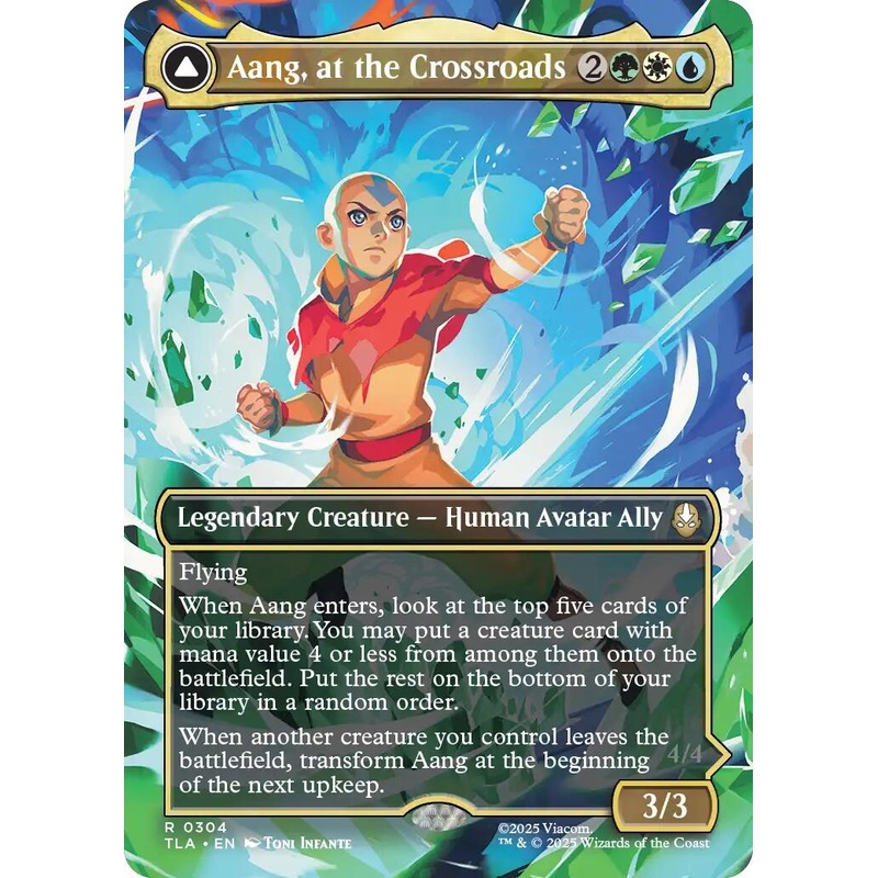 Set: Avatar: The Last Airbender Type: Legendary Creature Human Avatar Ally // Legendary Creature Rarity: Rare FlyingWhen Aang enters, look at the top five cards of your library. You may put a creature card with mana value 4 or less from among them onto the