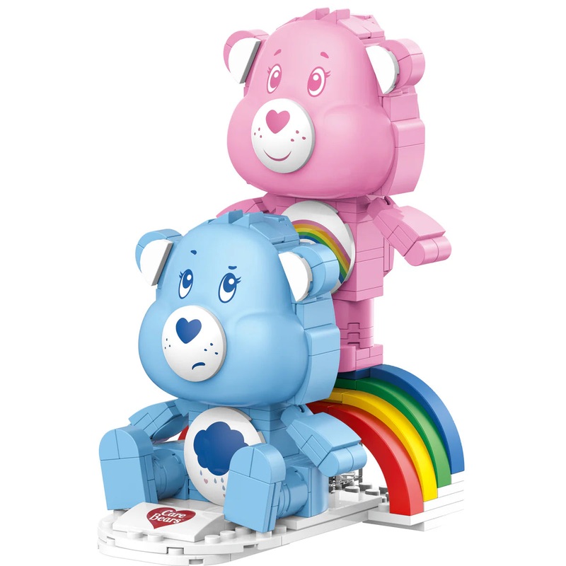 This charming Care Bears building set features the iconic Cheer Bear in soft pink, sitting atop a brick-built rainbow, and Grumpy Bear in baby blue, resting on the cloud-themed base. Both include printed belly badges, poseable arms, and a Care Bears logo o