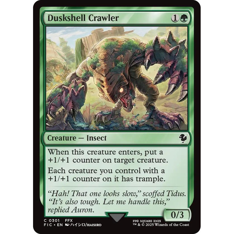 Set: FINAL FANTASY Commander Type: Creature Insect Rarity: Common Cost: {1}{G} When this creature enters, put a +1/+1 counter on target creature.Each creature you control with a +1/+1 counter on it has trample. "Hah! That one looks slow," scoffed Tidus. "I
