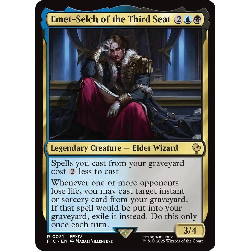 Set: FINAL FANTASY Commander Type: Legendary Creature Elder Wizard Rarity: Rare Cost: {2}{U}{B} Spells you cast from your graveyard cost 2 less to cast.Whenever one or more opponents lose life, you may cast target instant or sorcery card from your graveyar