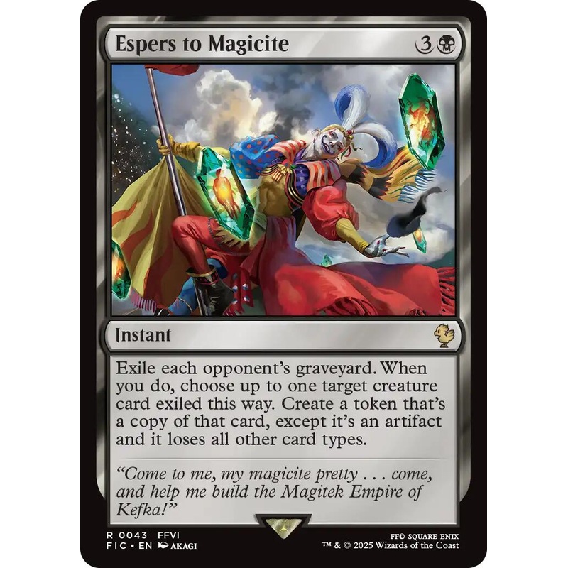 Set: FINAL FANTASY Commander Type: Instant Rarity: Rare Cost: {3}{B} Exile each opponent's graveyard. When you do, choose up to one target creature card exiled this way. Create a token that's a copy of that card, except it's an artifact and it loses all ot