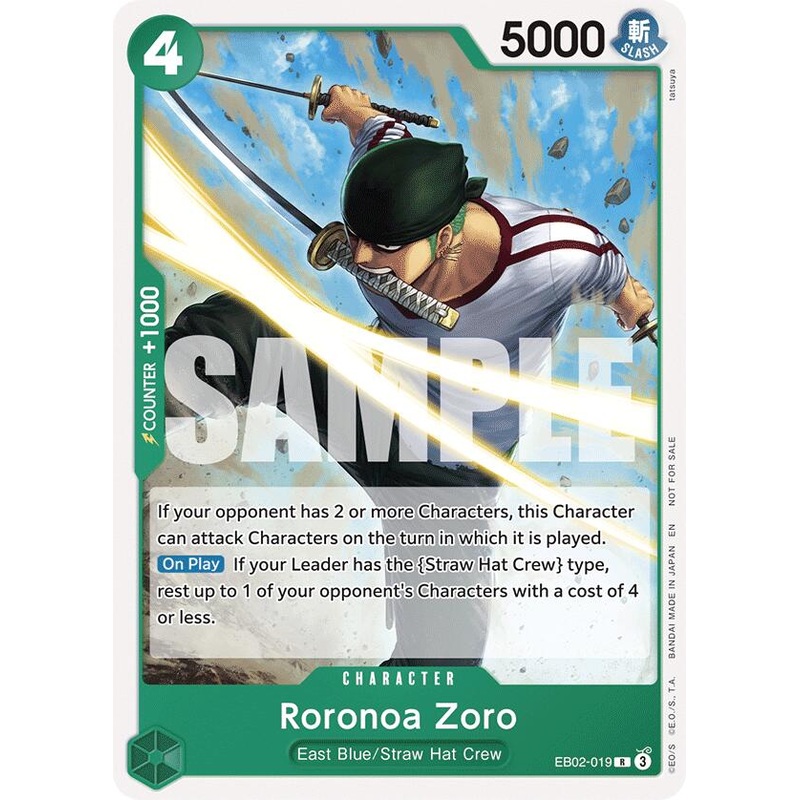 Set Name: One Piece Promotion Cards Card Number: EB02-019 Release Date: 2025-07-01 Rarity: Rare Card Type: Character Cost: 4 Power: 5000 If your opponent has 2 or more Characters, this Character can attack Characters on the turn in which it is played.[On P