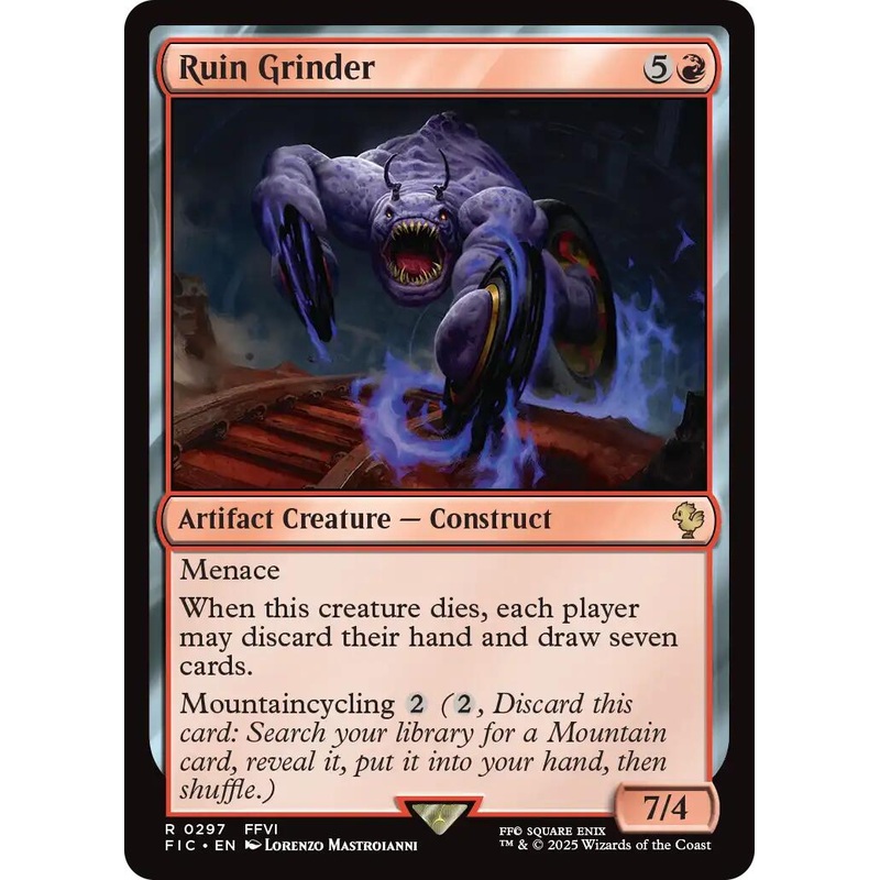 Set: FINAL FANTASY Commander Type: Artifact Creature Construct Rarity: Rare Cost: {5}{R} MenaceWhen this creature dies, each player may discard their hand and draw seven cards.Mountaincycling 2 (2, Discard this card: Search your library for a mountain card