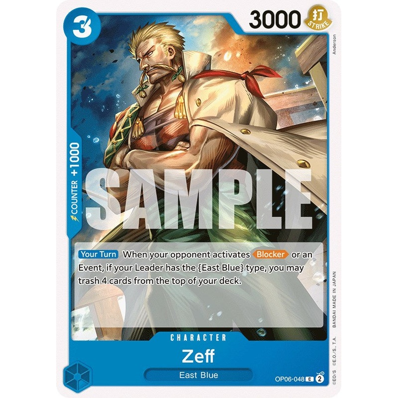 Set Name: Wings of the Captain Card Number: OP06-048 Release Date: 2024-03-15 Rarity: Common Card Type: Character Cost: 3 Power: 3000 [Your Turn] When your opponent activates [Blocker] or an Event, if your Leader has the [East Blue] type, you may trash 4 c