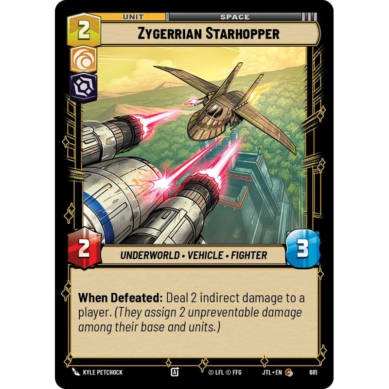 Set Name: Jump to Lightspeed Release Date: 2025-03-14 Rarity: Common Card Name: Zygerrian Starhopper Card Number: 681 Card Type: Unit Traits: Underworld,Vehicle,Fighter Cost: 2